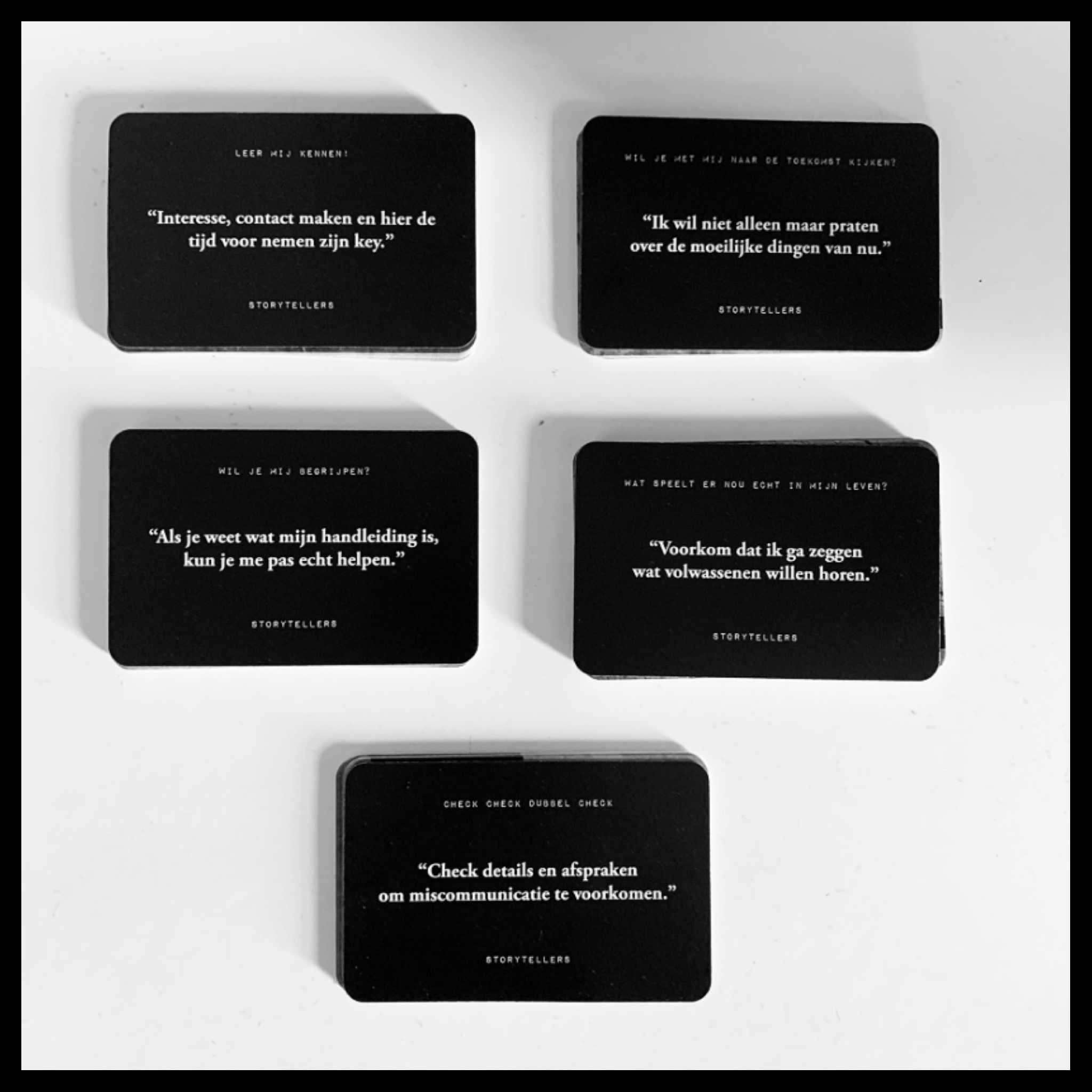 Storytellers delen hun ervaringen ook zodat volwassenen, leraren, ouders en professionals van hen kunnen leren. Want, jongeren hebben een uniek perspectief op de wereld. Alle vragen in het Storytellers vraagkaartenspel komen van jongeren die ervaring hebben met hulpverleners. We hebben hen gevraagd: ‘Wat waren de beste vragen die een hulpverlener je ooit heeft gesteld en zou elke hulpverlener moeten gebruiken in gesprekken met jongeren?’